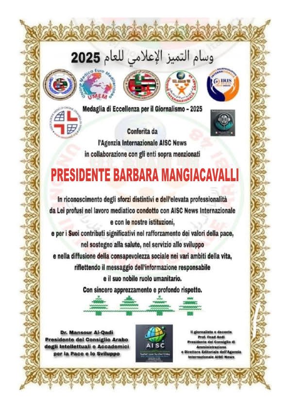 ROMA 29 DIC 2025 – Nel quadro delle celebrazioni dei 25 anni dell’AMSI, della rete internazionale AISC_NEWS, dei 12 anni del Movimento Uniti per Unire , sono stati consegnati oltre 250 attestati di riconoscimento a giornalisti, professionisti della sanità, esperti, collaboratori ed esponenti delle associazioni e dei movimenti attivi in 120 Paesi dall’agenzia Aisc_News_Internazionale e le associazioni citati nell’attestato.
