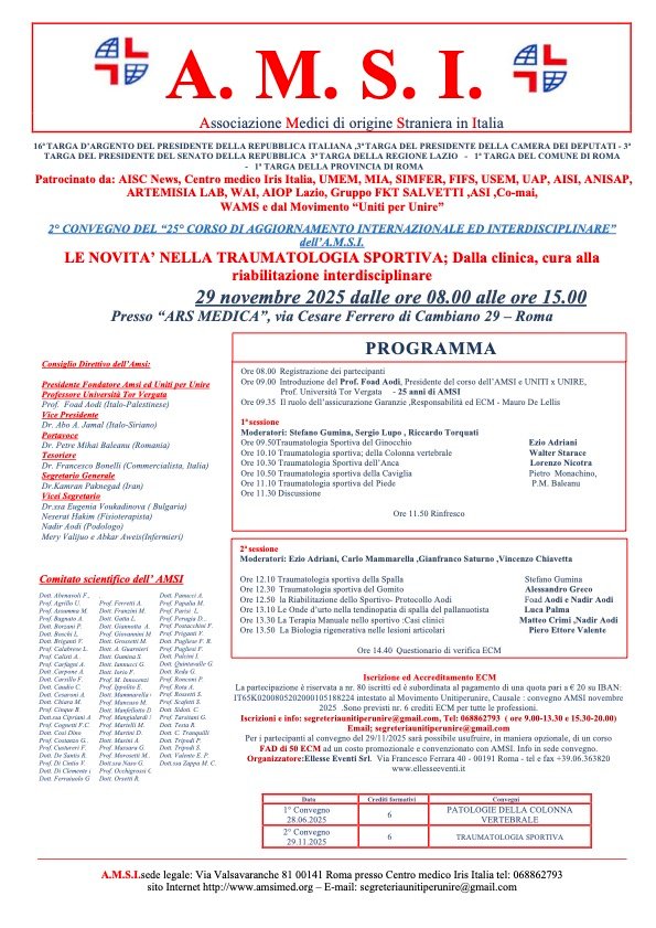 ROMA 3 NOV 2025 – Dopo il successo del primo incontro, l’Associazione Medici di Origine Straniera in Italia (AMSI) annuncia il 2° Convegno del 25° Corso Internazionale e Interdisciplinare di Aggiornamento, dedicato alle novità nella traumatologia dello sport.