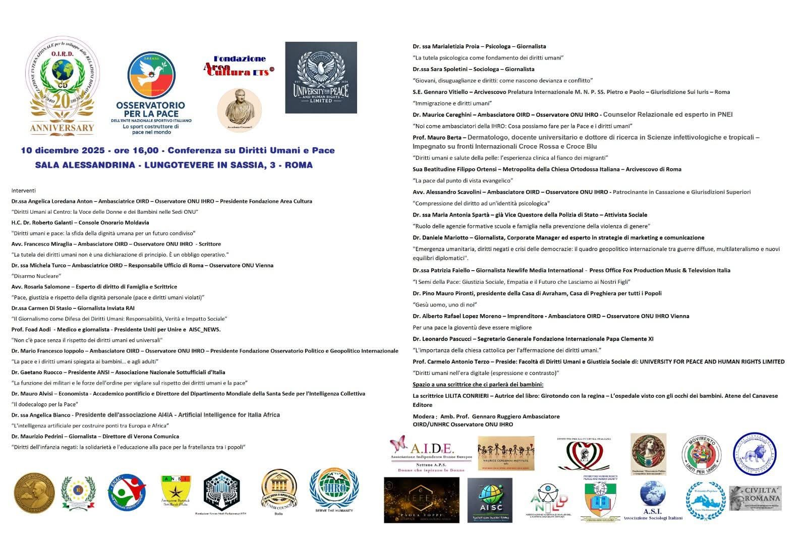 Il 10 dicembre 2025 la Sala Alessandrina ospiterà la Conferenza su Diritti Umani e Pace promossa da OIRD – Osservatorio Internazionale per i Diritti Umani, IHRO – Osservatore ONU per i Diritti Umani, Fondazione Area Cultura e partner internazionali. L’incontro riunirà diplomatici, religiosi, magistrati, esperti di salute, psicologi, sociologi, rappresentanti delle forze dell’ordine, giornalisti e numerose associazioni attive nella tutela dei diritti fondamentali.