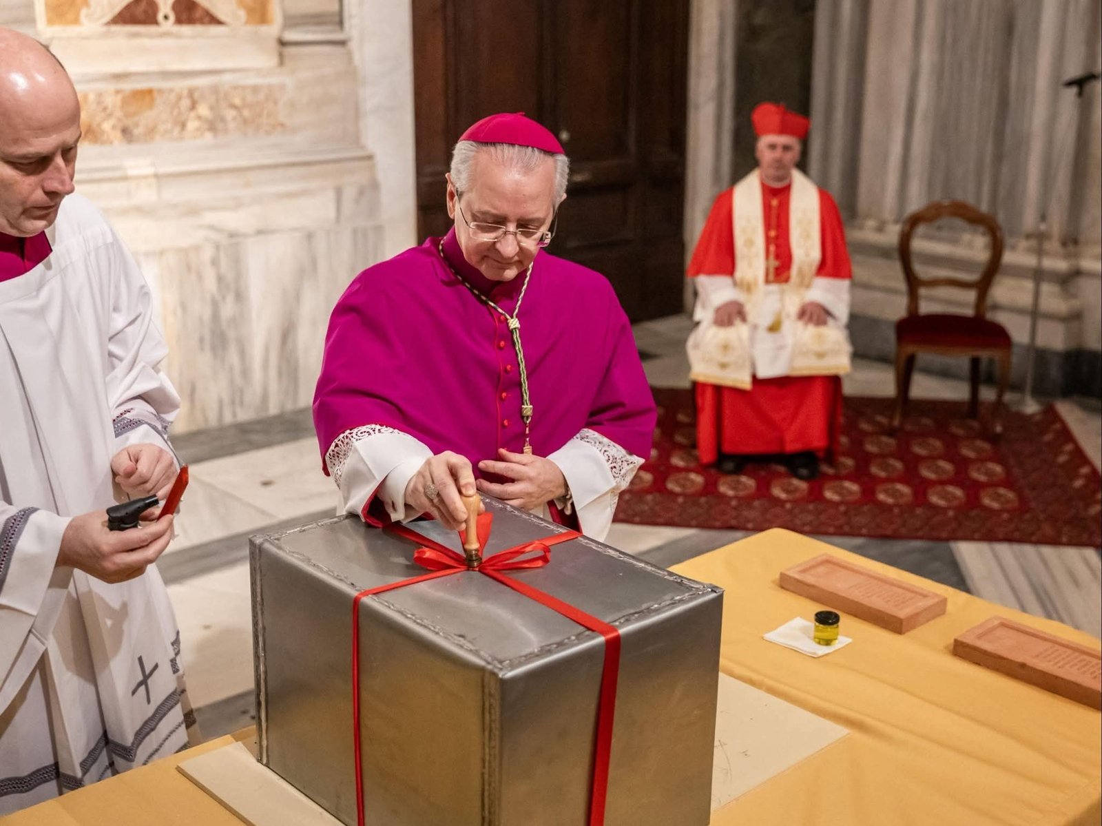 Come da tradizione, all’interno del muro vengono inserite, durante il rito, capsule di bronzo (una per ogni Porta) contenenti il verbale di chiusura della Porta Santa, la chiave della Porta Santa, alcune medaglie pontificie dall’ultima chiusura della Porta Santa, dal 2016 fino a oggi, e, laddove realizzata, una medaglia commemorativa della Basilica.