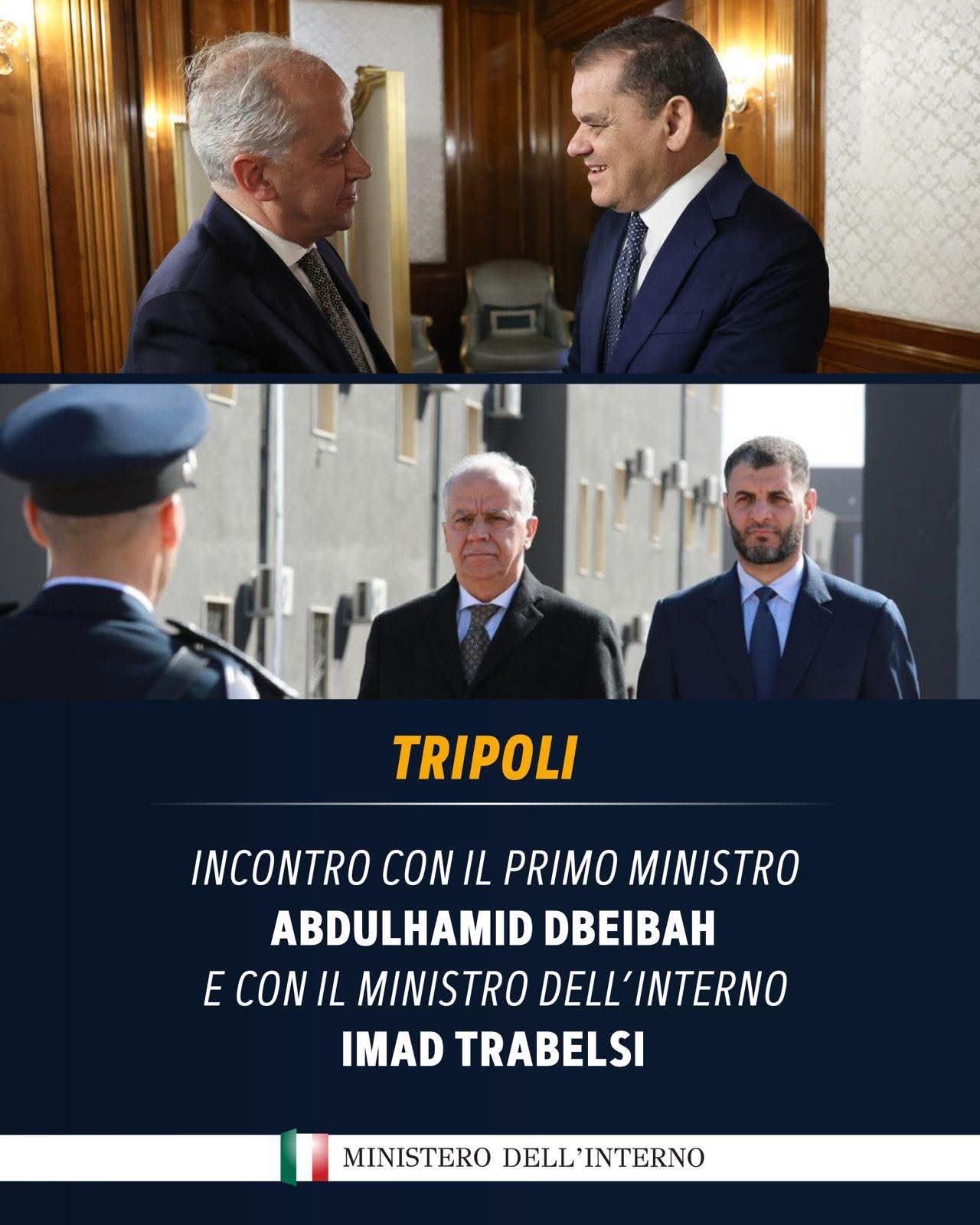 Ho incontrato a Tripoli il mio omologo libico Imad Trabelsi per un confronto sui principali dossier di comune interesse, con particolare riferimento al contrasto dell’immigrazione illegale ed al potenziamento della cooperazione bilaterale in materia di sicurezza.