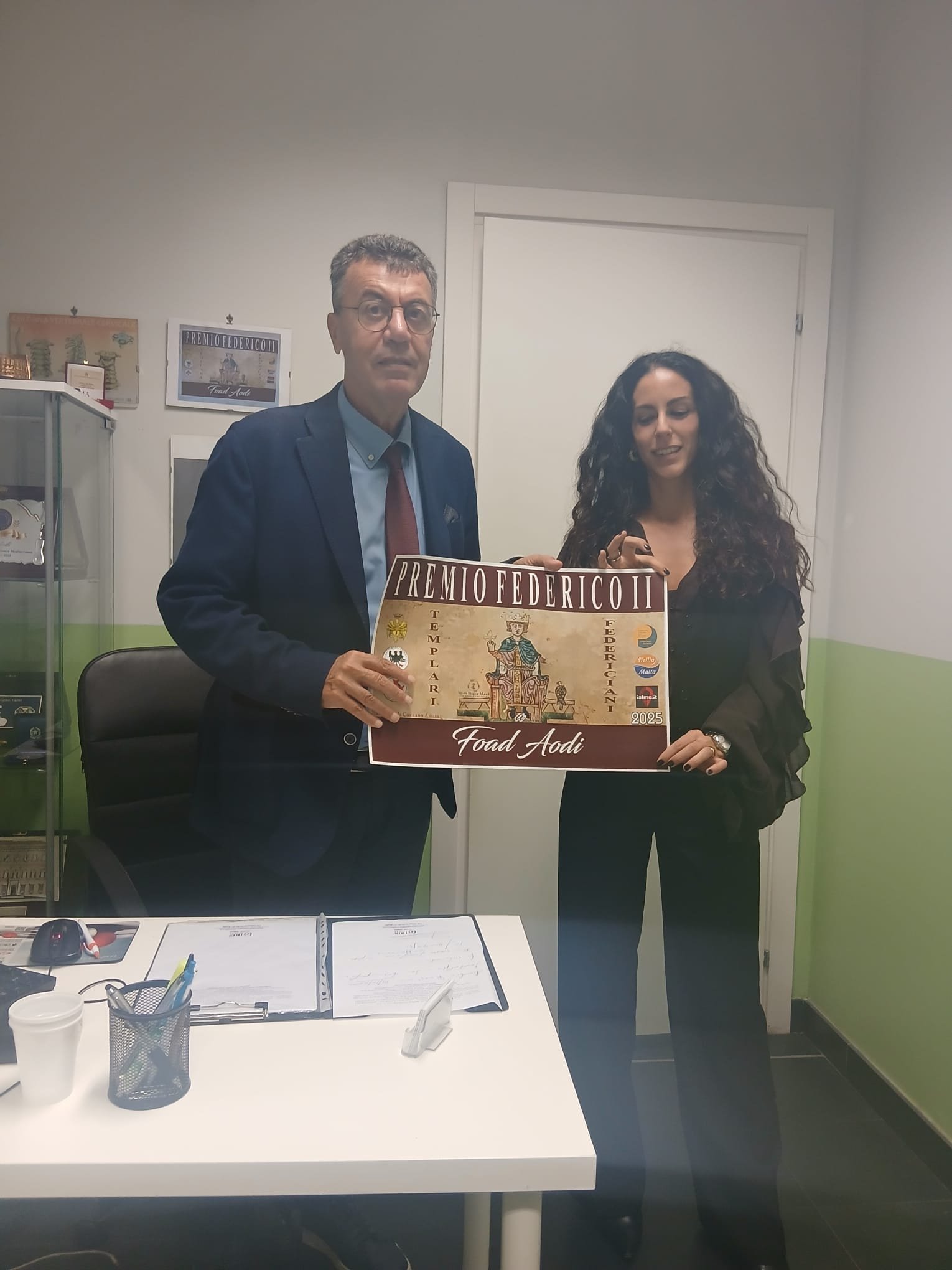 Durante l’incontro, l’avvocata Awad ha consegnato al Presidente Aodi il Premio Federico II, riconoscimento speciale dedicato ai primi 25 anni di attività dell’AMSI – Associazione Medici di Origine Straniera in Italia. Il premio era stato ritirato in Sicilia dal padre di Shadia, il Dr. Hasan Awad, a nome della famiglia.