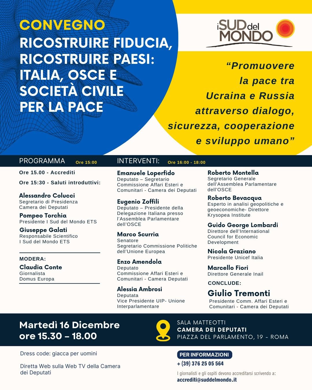 Martedì 16 dicembre, alle ore 15.30, presso la Sala Matteotti della Camera dei Deputati a Roma, si terrà il convegno promosso dall’associazione I Sud del Mondo ETS dal titolo “Ricostruire fiducia, ricostruire Paesi: Italia, OSCE e società civile per la pace – Promuovere la pace tra Ucraina e Russia attraverso il dialogo, la sicurezza, la cooperazione e lo sviluppo umano”.