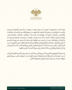 Il delegato siriano ha espresso “profonda gratitudine all’Egitto” per la determinazione con cui ha continuato a portare avanti questa battaglia diplomatica anche nei periodi più difficili del conflitto siriano.