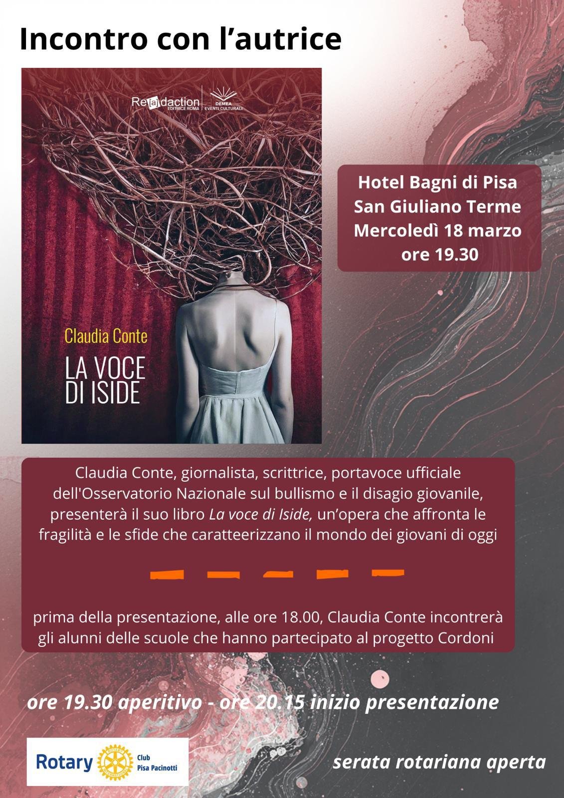 Mercoledì 18 marzo, presso l’Hotel Bagni di Pisa – San Giuliano Terme, alle 18:00, incontro con gli studenti, accompagnati da insegnanti e genitori, insieme a Claudia Conte, giornalista, scrittrice, opinionista televisiva e conduttrice su Rai Radio1 del programma “La Mezz’ora Legale”, nonché portavoce dell’Osservatorio Nazionale sul Bullismo e il Disagio Giovanile. Un’occasione di confronto sui temi che più riguardano i giovani oggi: isolamento, sopraffazione, fragilità emotiva e violenza.