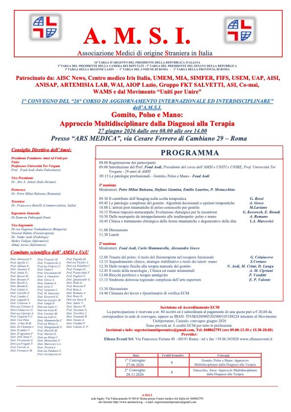 Si svolgerà il 27 giugno 2026, dalle ore 08.00 alle ore 14.40, presso ARS Medica, in via Cesare Ferrero di Cambiano 29 a Roma, il 1° Convegno del “26° Corso di Aggiornamento Internazionale ed Interdisciplinare” dell’AMSI – Associazione Medici di Origine Straniera in Italia, dedicato al tema “Gomito, Polso e Mano: approccio multidisciplinare dalla diagnosi alla terapia”.