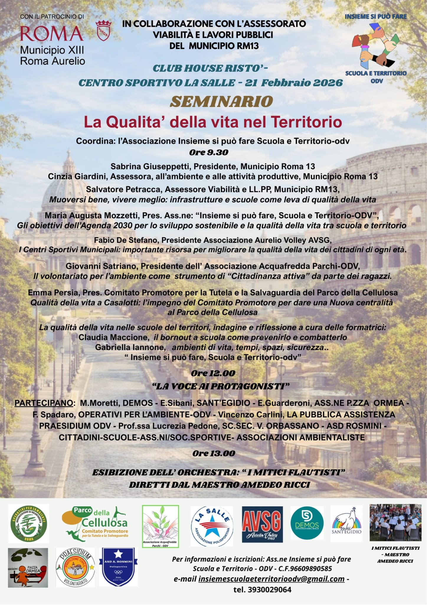 La prima iniziativa è un seminario dedicato alla “Qualità della vita nel territorio”, in programma il 21 febbraio a partire dalle ore 9.30, che si svolgerà presso il Centro sportivo La Salle nella zona Boccea. L’incontro nasce dalla collaborazione con l’Assessorato ai Lavori Pubblici e coinvolgerà associazioni sportive, ambientaliste e di quartiere del Municipio. L’obiettivo è aprire un confronto concreto su benessere urbano, spazi pubblici, sport, ambiente e vivibilità, mettendo in dialogo istituzioni, realtà associative e cittadini.